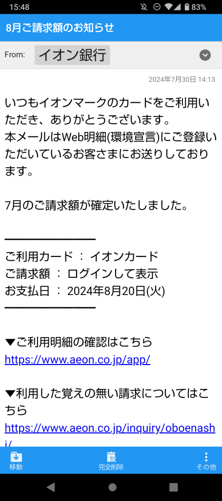 [AEON CARD] 8月ご請求額のお知らせ