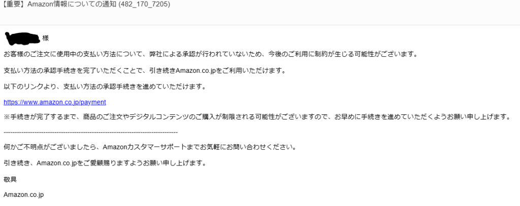 私が実際に受信した詐欺メールは、件名が「Amazon情報についての通知 (482_170_7205)」、差出人が「Amazon Business」となっていました。本文は以下のような内容でした(一部伏字)。