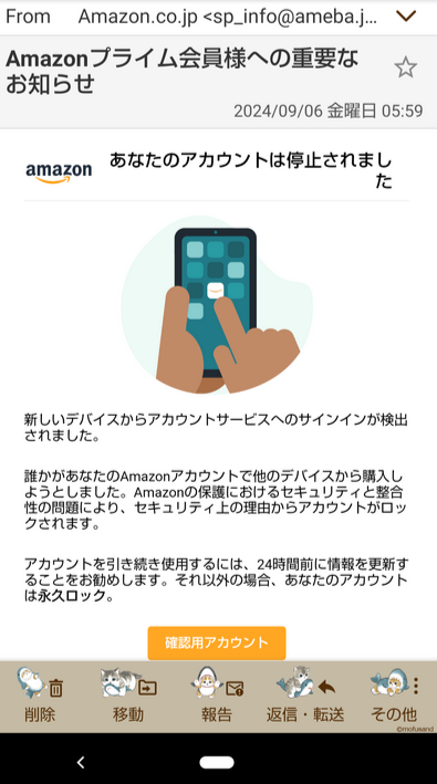 Amazonからの正式なメールは、amazon.co.jp のドメインを使用しています。ameba.jp からのメールは、明らかに怪しいですね。Amazonからの重要な連絡であれば、公式のドメインを使うはずです。フリーメールアドレスからの連絡は、まず疑ってかかるべきでしょう。また、メールアドレスの「sp_info」の部分も、Amazonの正式なメールアドレスとは異なる形式です。