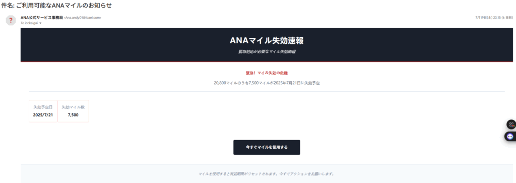 メールを開くと、黒地に白文字のインパクトある見出しで「ANAマイル失効速報」と書かれ、さらに赤字で