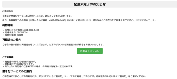 ご都合の良い日時に再配達させていただきます。以下のボタンから再配達のお手続きをお願いいたします。