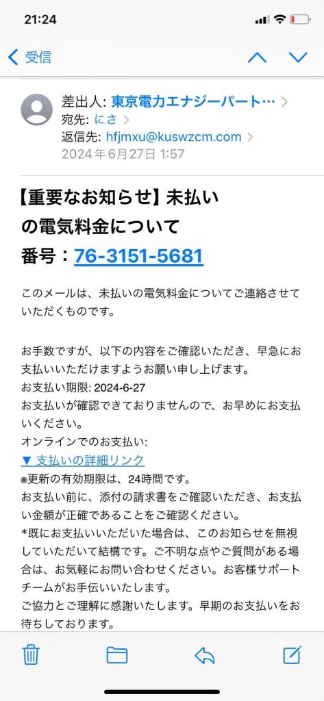 2024年6月27日って、もう過ぎてますし!焦らせるつもりですね。支払期限が異常に短いのも、詐欺メールの特徴の一つです。すぐに支払いをしないと電気を止めると脅し、冷静な判断力を奪おうとしているのです。焦らず、まずは請求内容が正しいかどうかを確認しましょう。不安な場合は、東京電力エナジーパートナーのカスタマーセンターに直接問い合わせましょう。