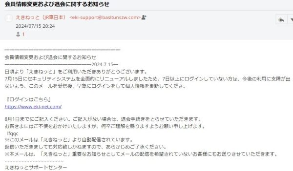 こんな退会処理聞いたことない!: えきねっとでは、一定期間ログインしていないからといって、予告なしにアカウントを自動的に退会させることはありません。このような内容のメールは、フィッシング詐欺の可能性が高いので注意しましょう。えきねっとの公式サイトや公式アプリからログインし、アカウントの状態を確認することをお勧めします。
