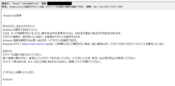 先日、筆者の元にも「Amazon.co.jp にご登録のアカウント(名前、パスワード、その他個人情報)の確認 [TIME]」という件名の不審なメールが届きました。一見、Amazonからの公式メールのように見えますが、アカウント情報に不備があるため72時間以内に確認しないとアカウントがロックされると記載されており、筆者を不安にさせる内容でした。しかし、よく見ると日本語の表現が不自然であったり、送信元のメールアドレスがAmazonの公式アドレスと異なっていたりと、いくつかの不審な点が見受けられました。