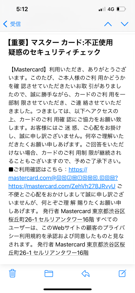 【Mastercard】利用いただき、ありがとうございます。このたび、ご本人様のご利 用かどうかを確 認させていただきたいお取 引がありましたので、誠に勝手ながら、カードのご利 用を一部制 限させていただき、ご連 絡させていただきました。つきましては、以下ヘアクセスの上、カードのご利 用確 認にご協力をお願い致します。お客様にはご 迷 惑、ご心配をお掛けし、誠に申し訳ございません。何卒ご理解いただきたくお願い申しあげます。ご回答をいただけない場合、カードのご利 用制 限が継続されることもございますので、予めご了承下さい。