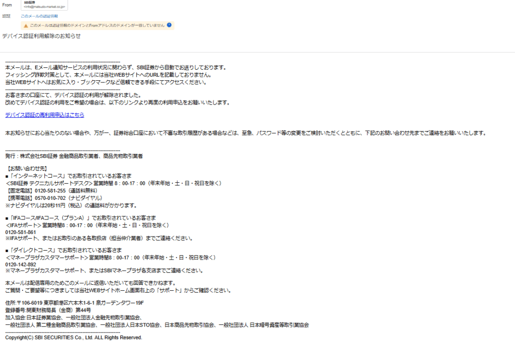 最も重要な証拠だ。本物のSBI証券が使うメールアドレスのドメイン(@マークより後ろの部分)は、必ず決まっている。例えば、@sbigroup.co.jpや@sbisec.co.jpといった公式のものだ。