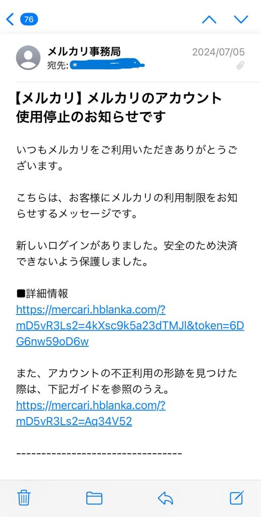 メール本文中のリンク (https://mercari.hblanka.com/…) をクリックするのは絶対にNG! 個人情報やクレジットカード情報を盗み取ろうとする罠かもしれません。リンクの上にカーソルを合わせると、実際のリンク先URLが表示されます。メルカリの公式URL(https://jp.mercari.com/)と異なる場合は、クリックしてはいけません。また、URLが短縮されている場合も、安易にクリックせず、URL展開ツールなどを使って安全性を確認してからアクセスしましょう。